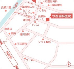 長瀬駅北側まなびや通商店街を100m行き、右手タバコ屋角を右折し、30m左手に長瀬郵便局、その隣です。 (駅のホームに看板があります)